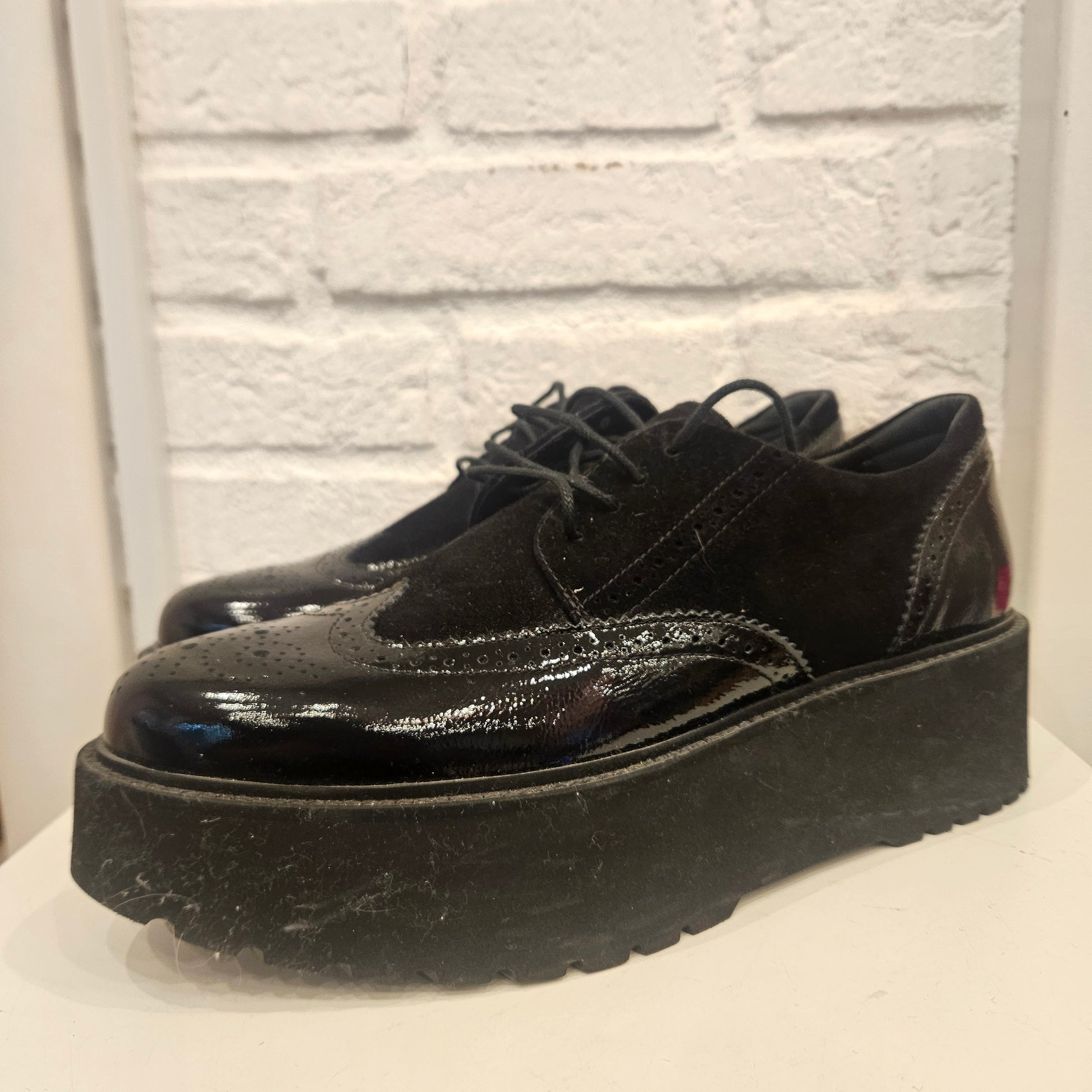 Scarpe nere in vernice stringate Hogan con suola rialzato, articolo in ottime condizioni indossate per oropa, sono comprese di scatola e dustbag