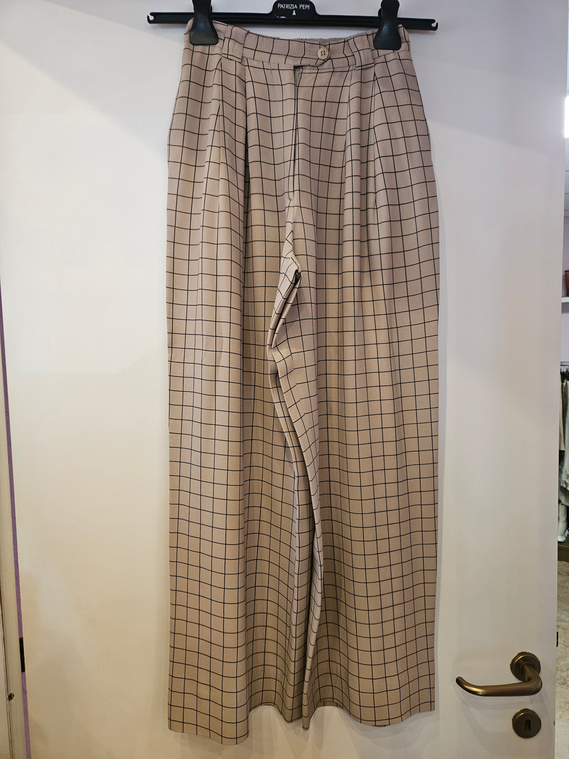 Pantaloni Giorgio Armani tg 36 colorazione beige e quadretti neri, gamba molto ampia.