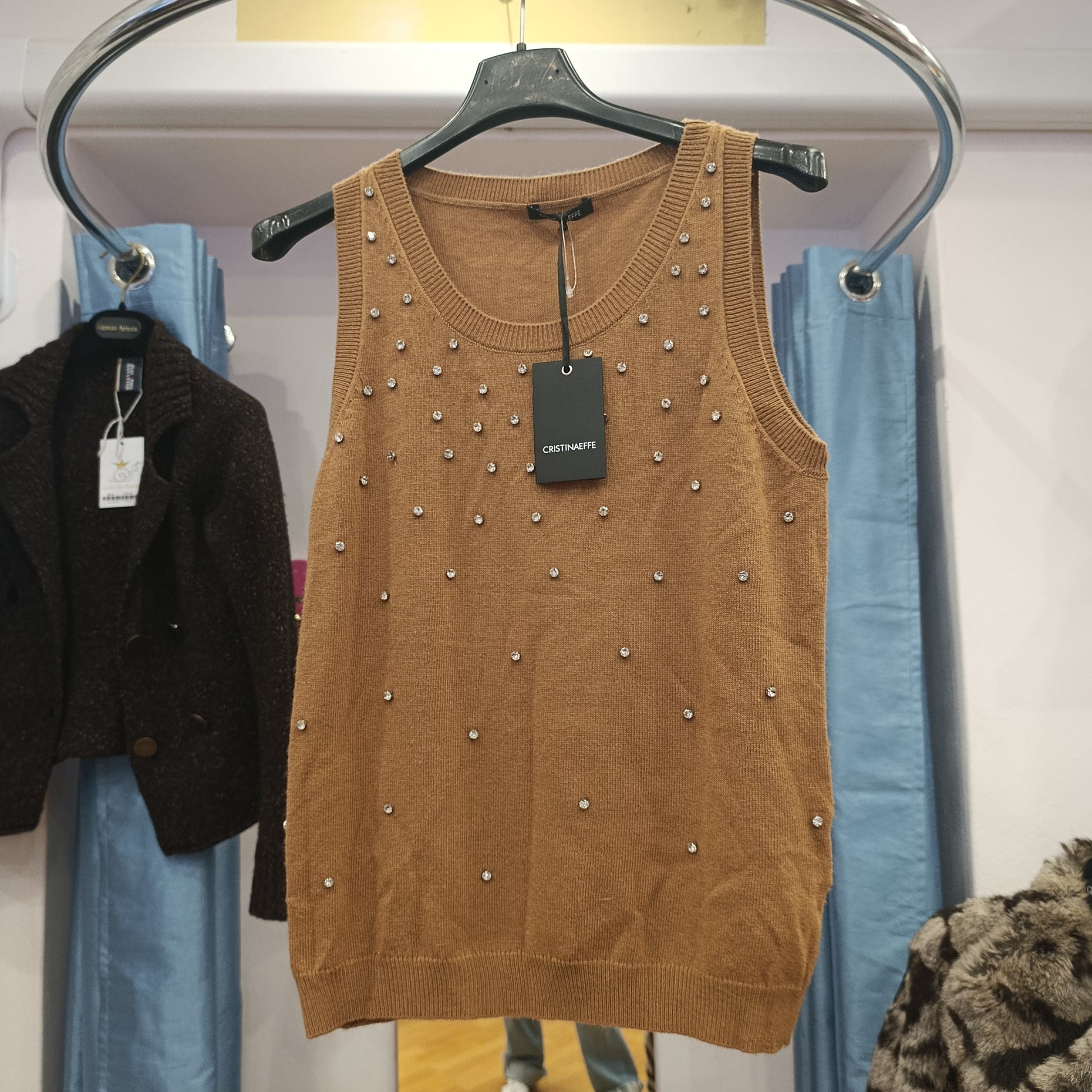 Bellissimo sottogiacca smanicato cammello con strass argento Cristina Effe tg M.