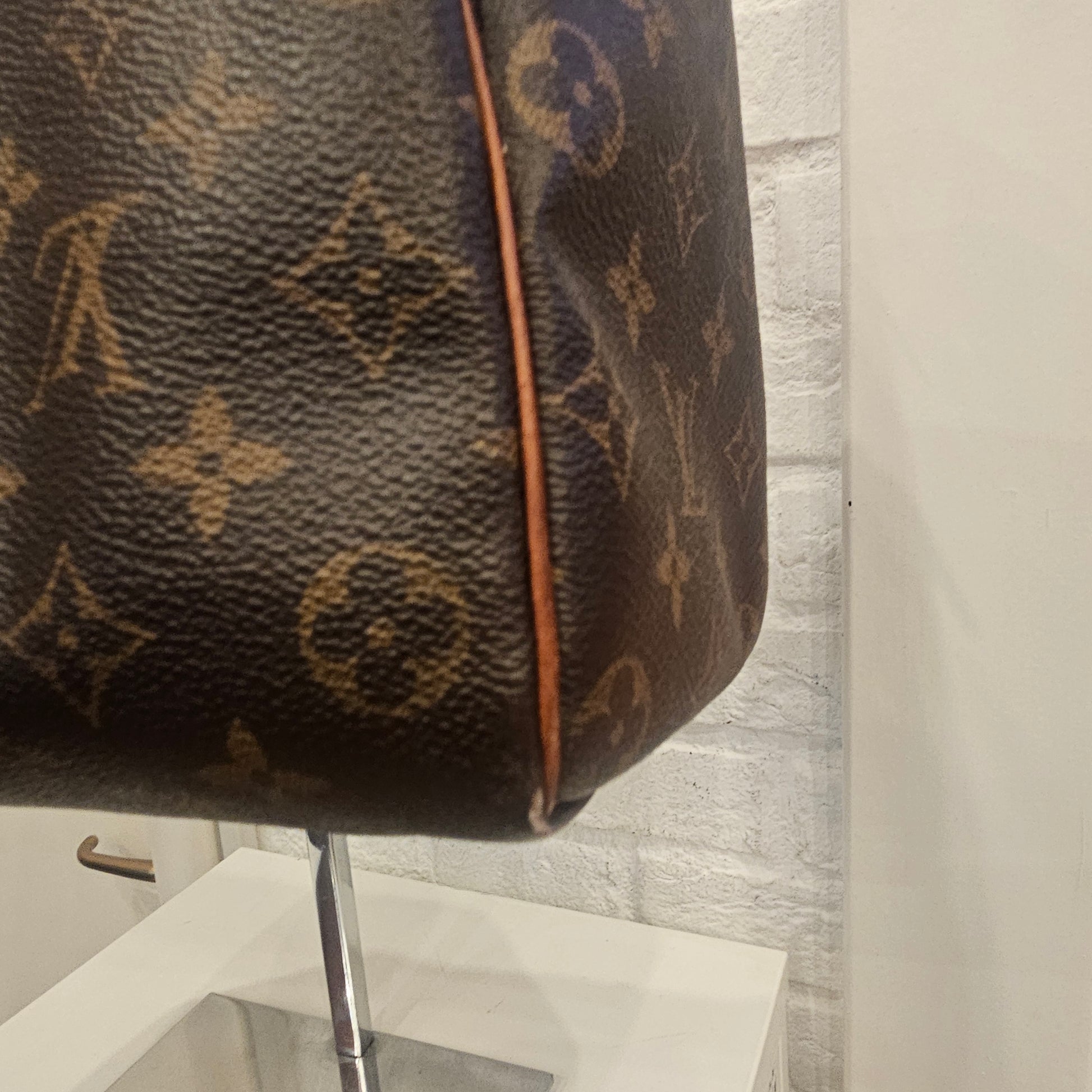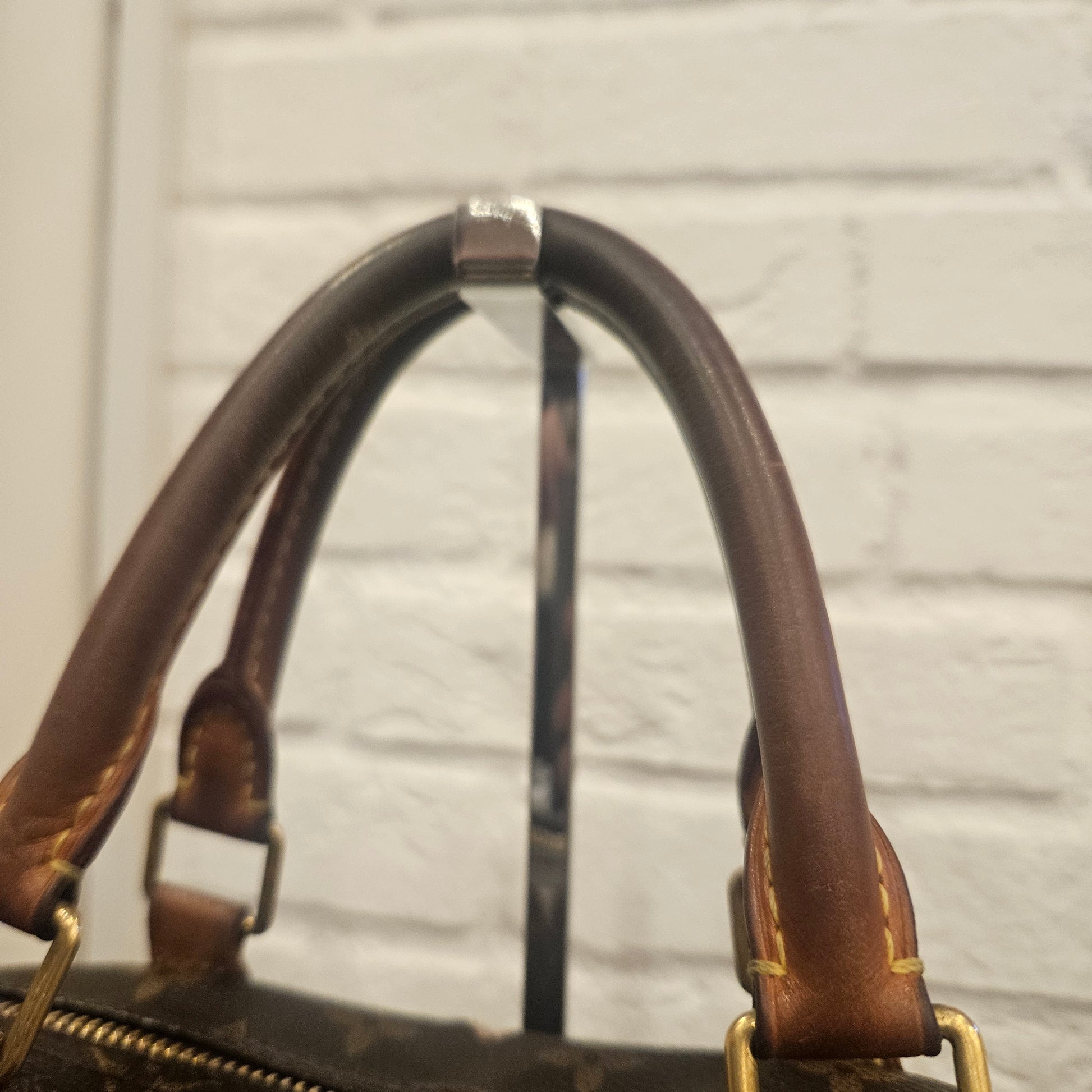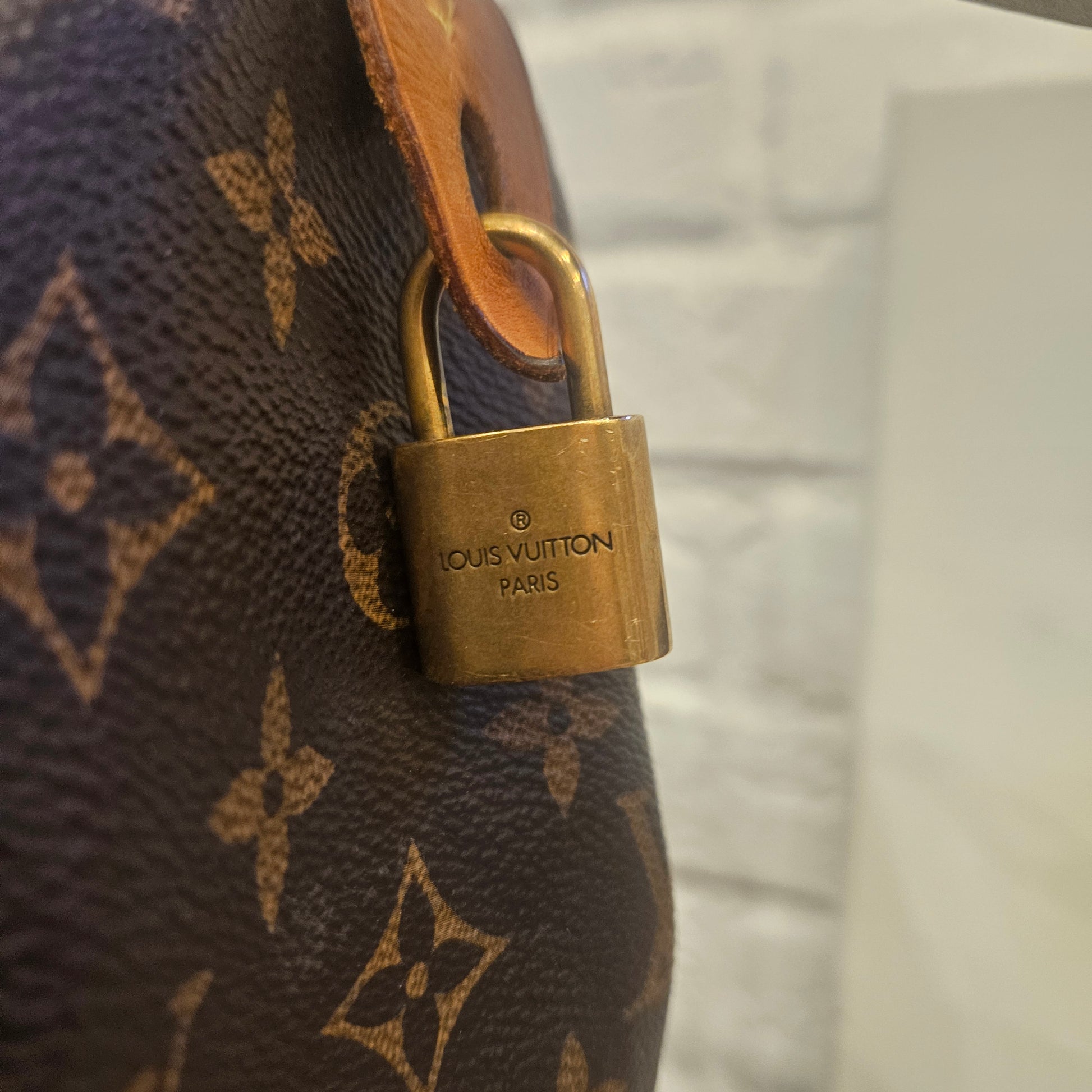Speedy 35 Louis Vuitton anno 2015 con classico tessuto canvas monogram e inserti pelle marrone, borsa in buone condizioni estetiche gli inserti in pelle presentano classici annerimenti LV e sul retro segnaliamo una piccola crepa.