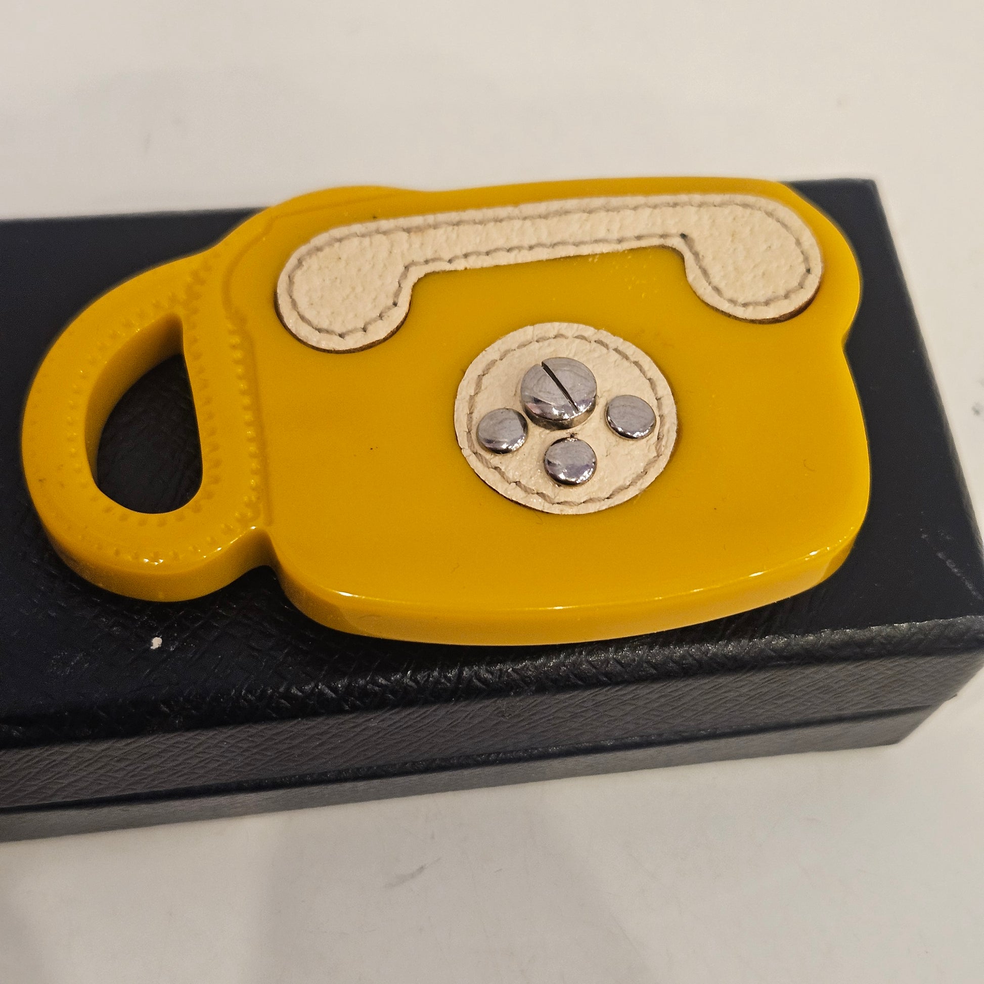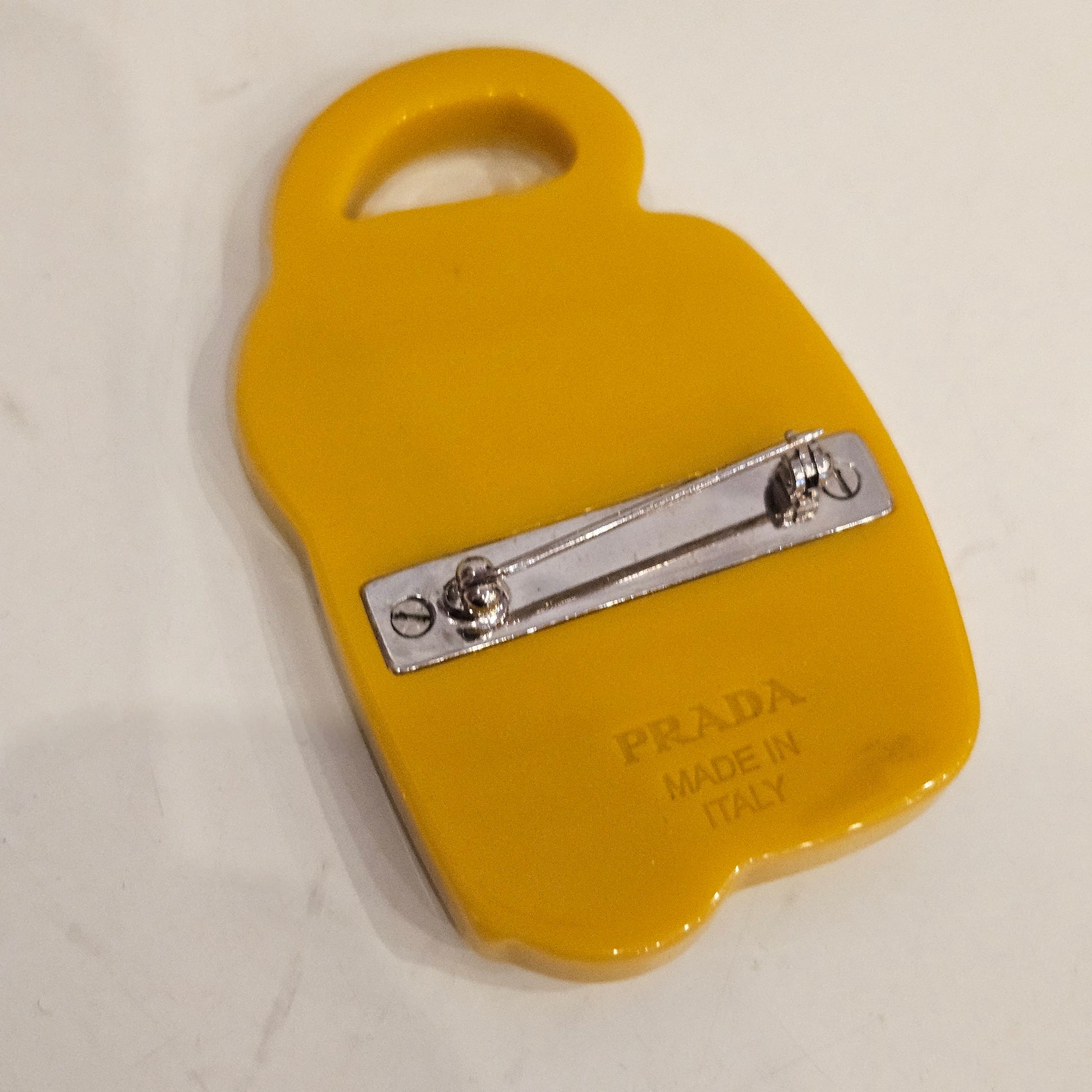 Spilla vintage prada in colorazione gialla e inserti in pelle beige