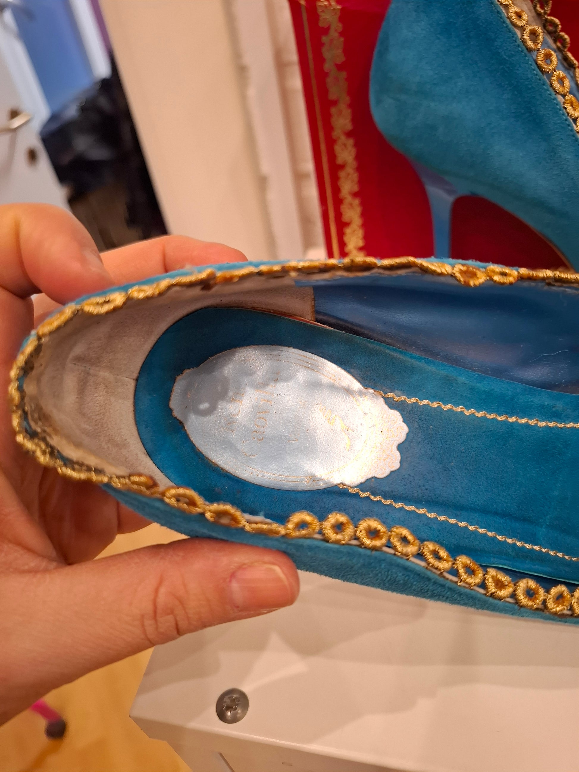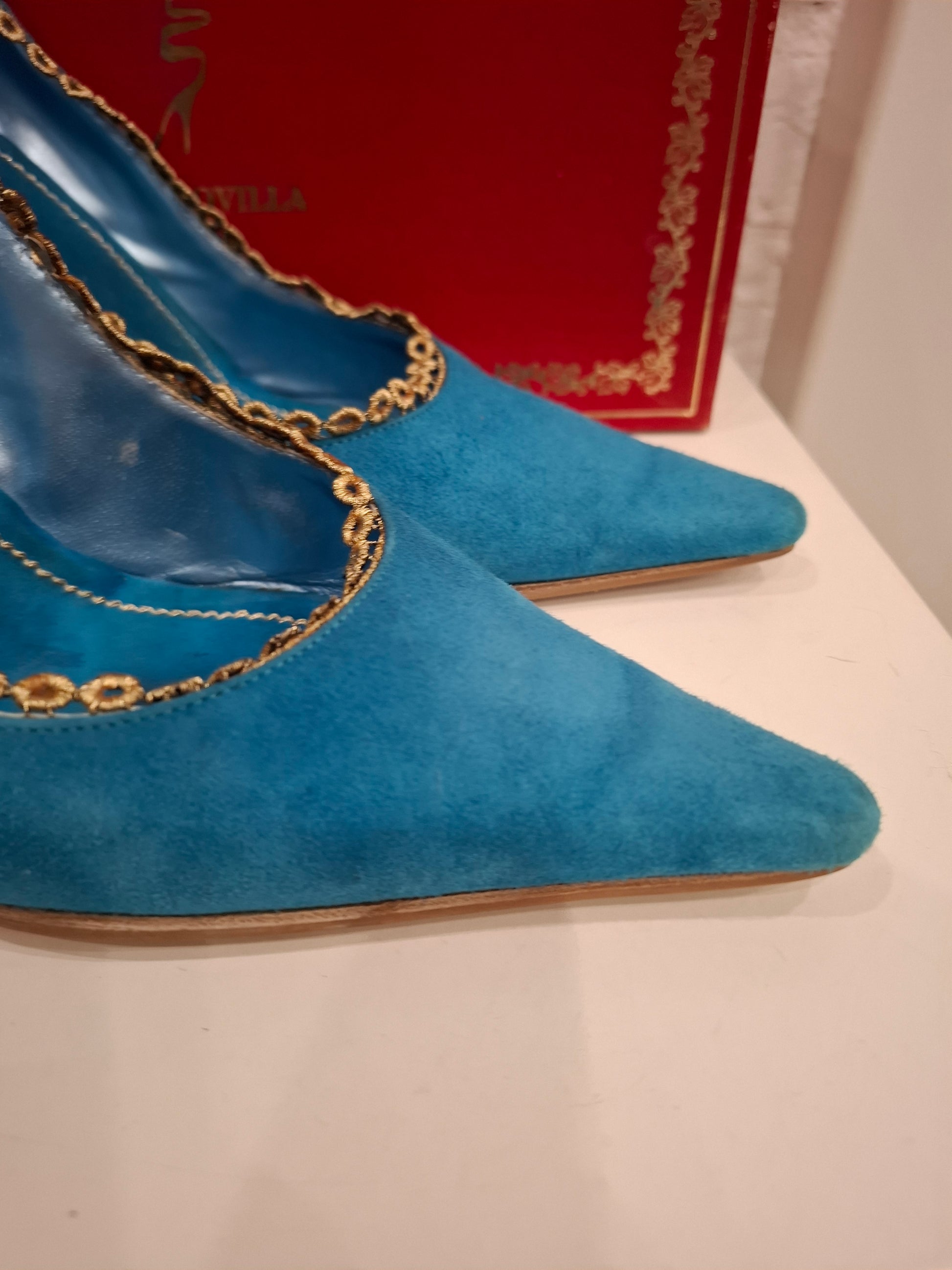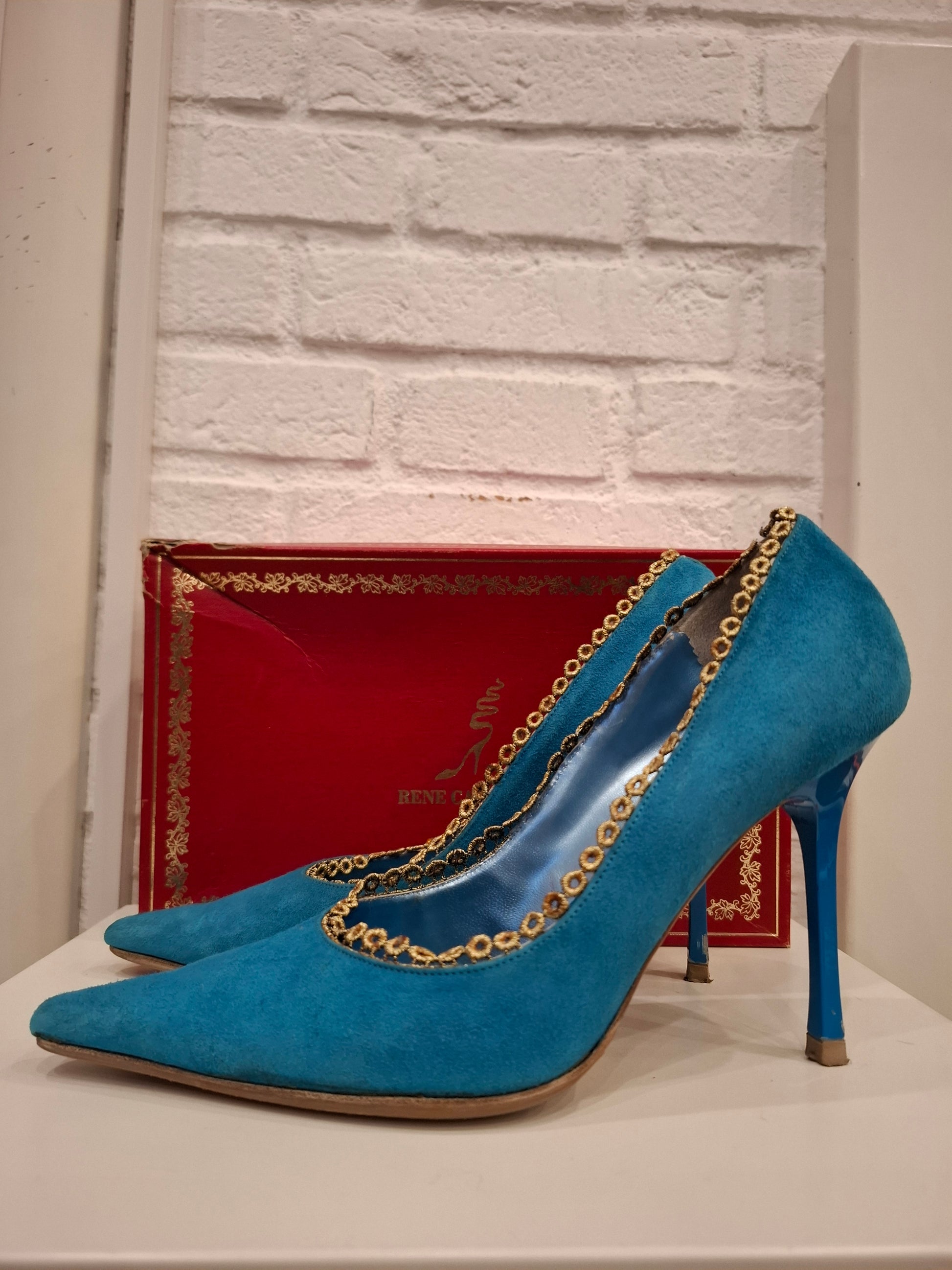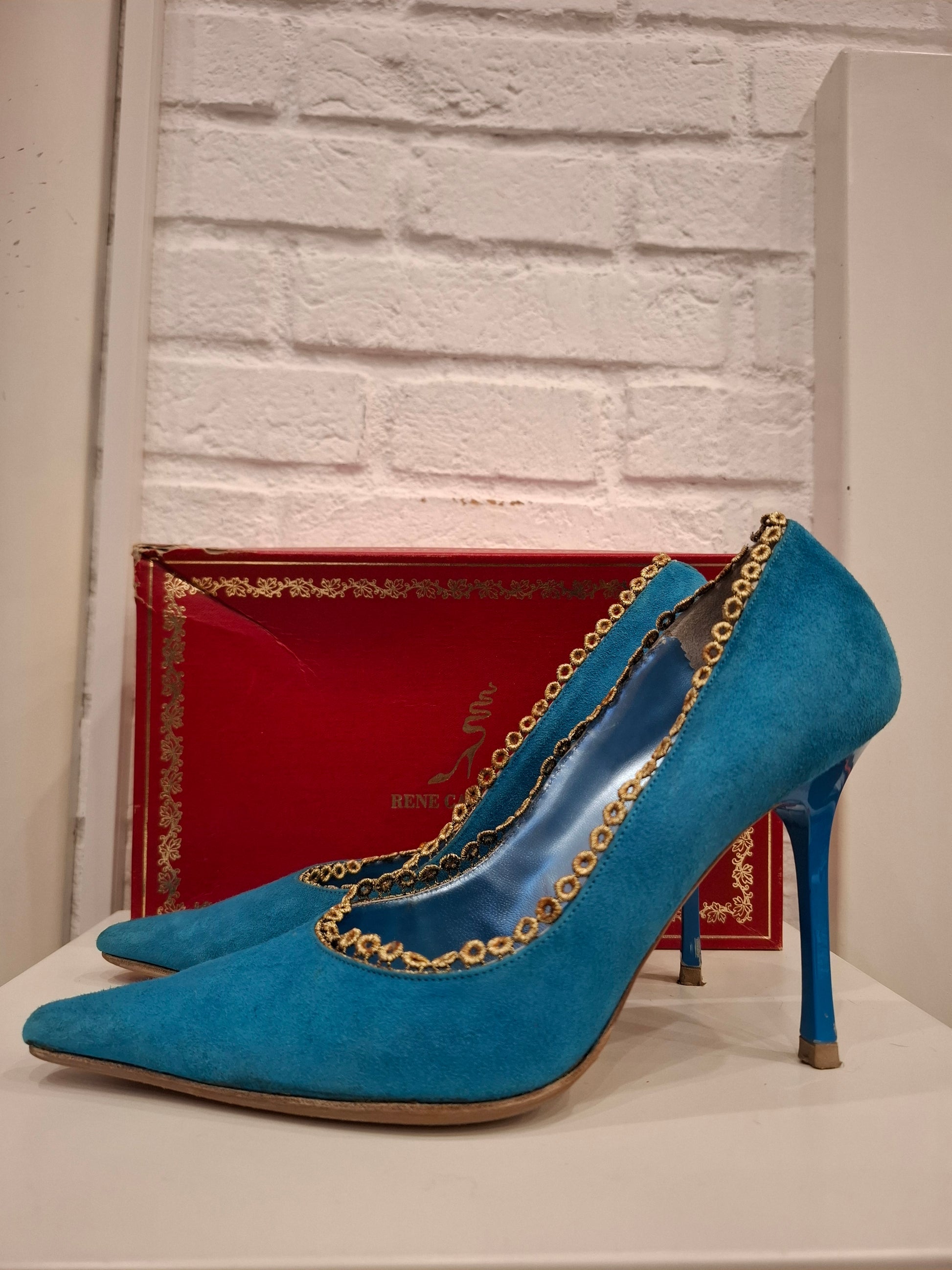 Tacco in camoscio blu china Rene Caovilla con pizzo dorato