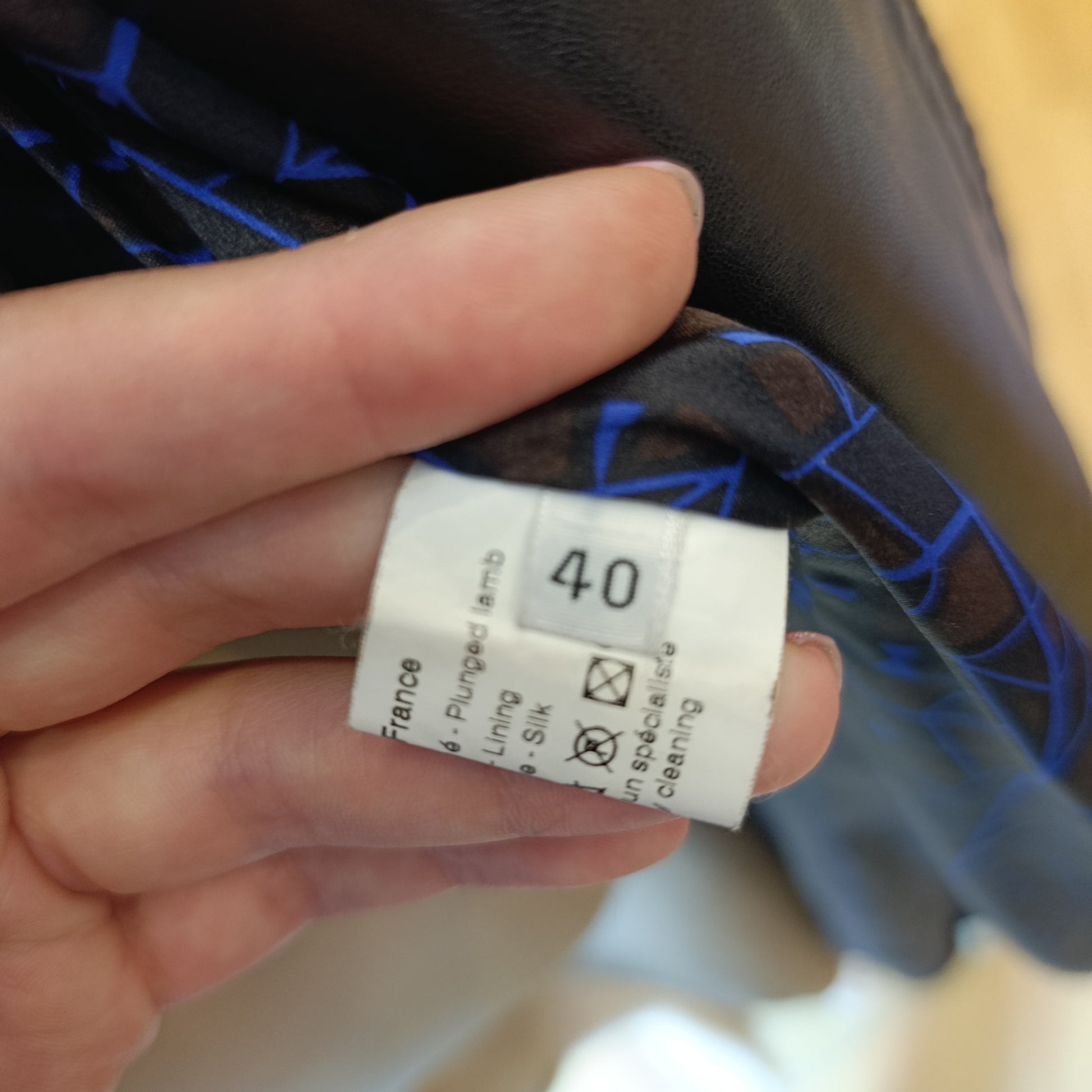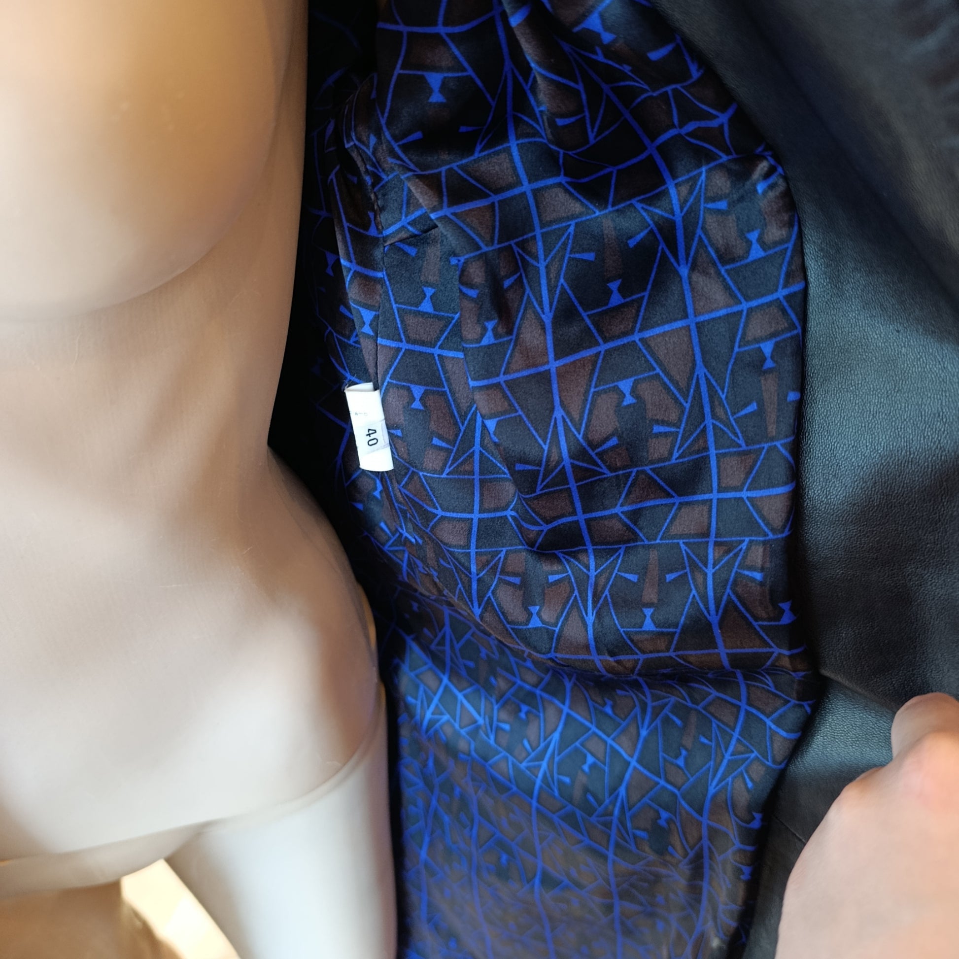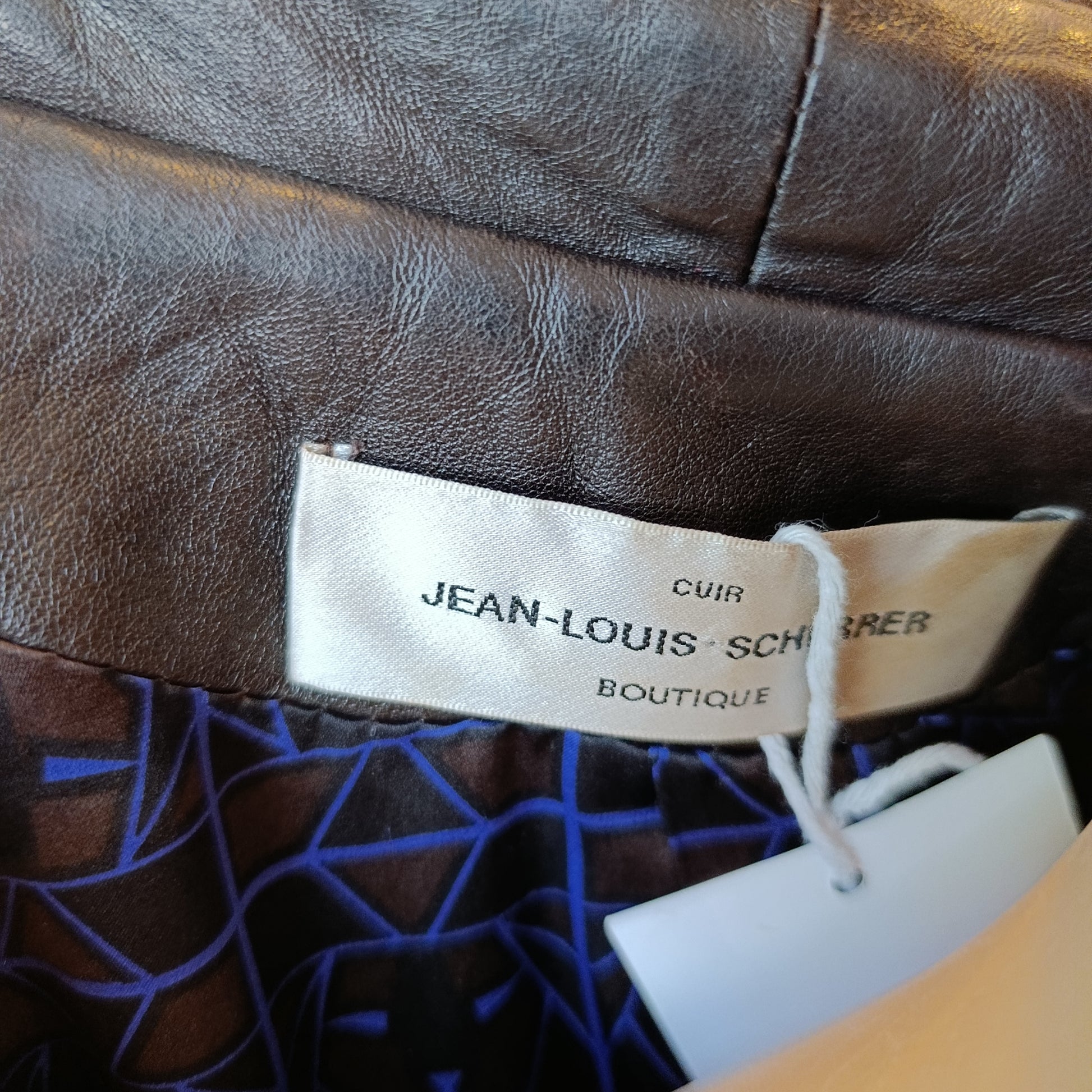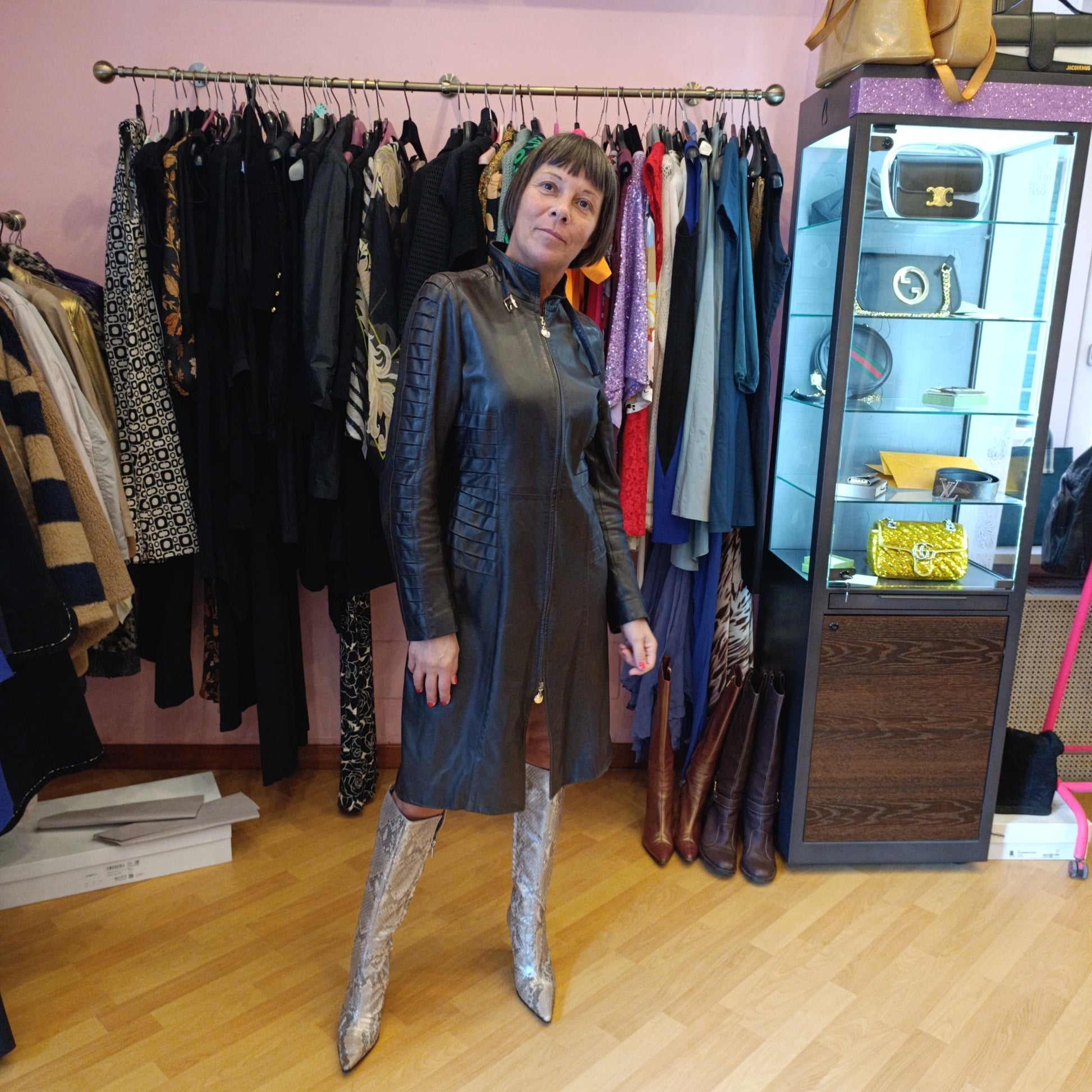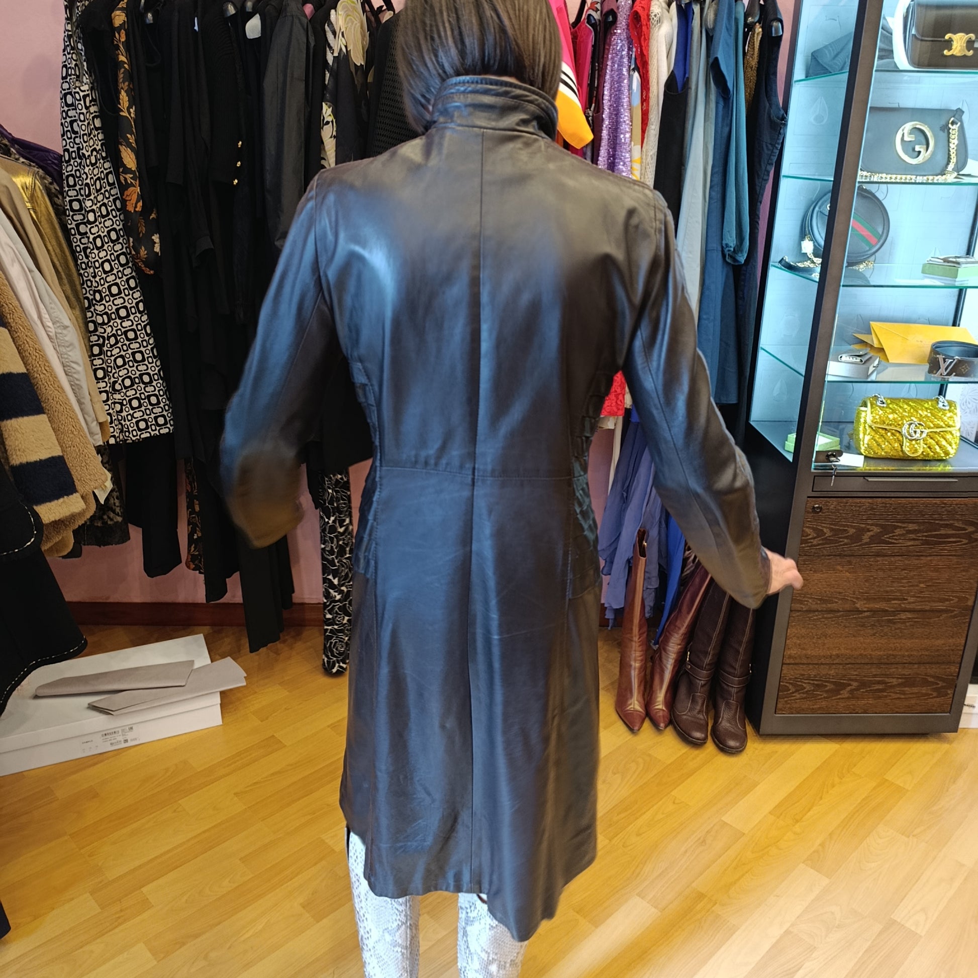 Trench in pelle di vitello morbidissima colorazione marrone scuro di Jean-louis scherrer tg 40, fodera in pura seta con fantasia geometrica in viola, condizioni ottimali