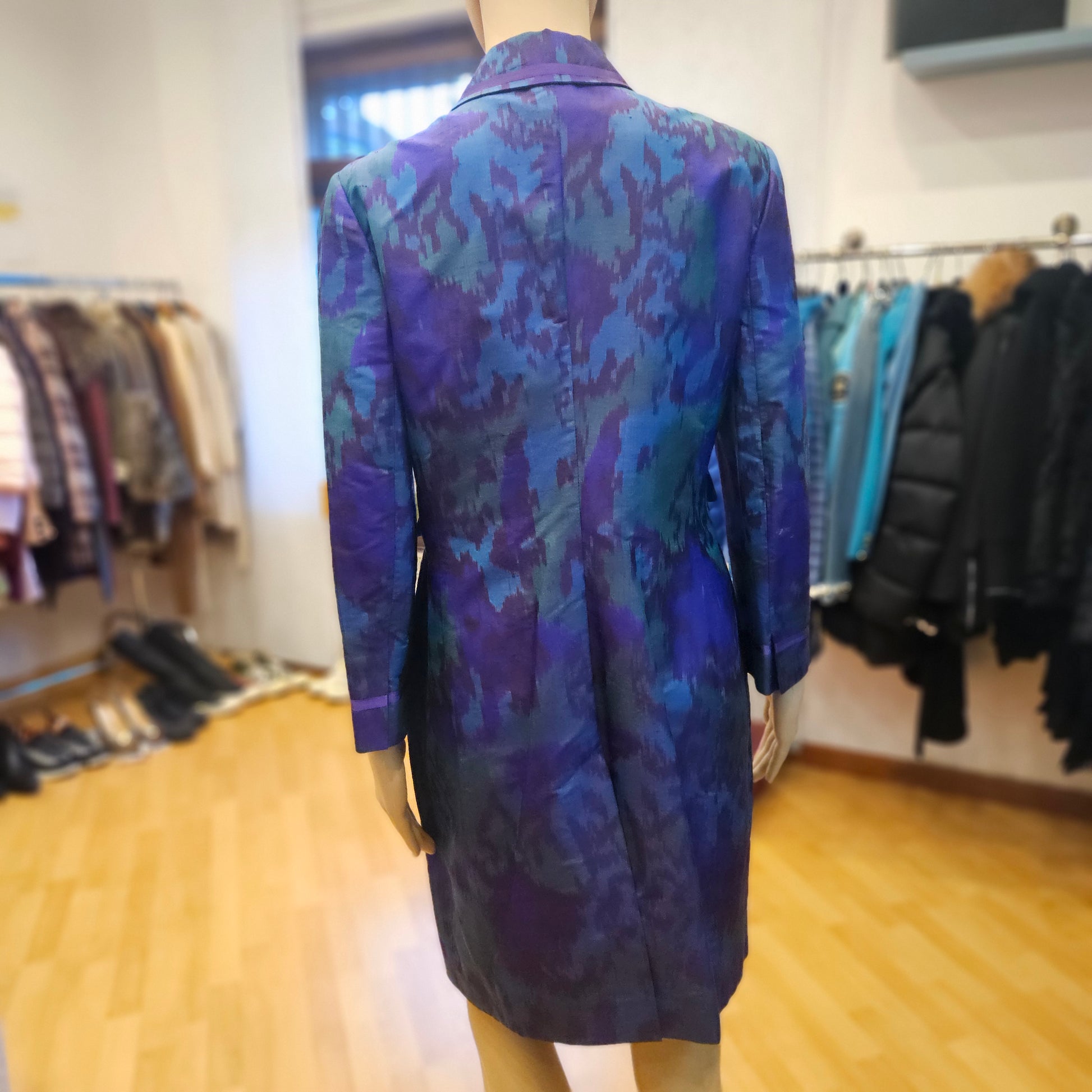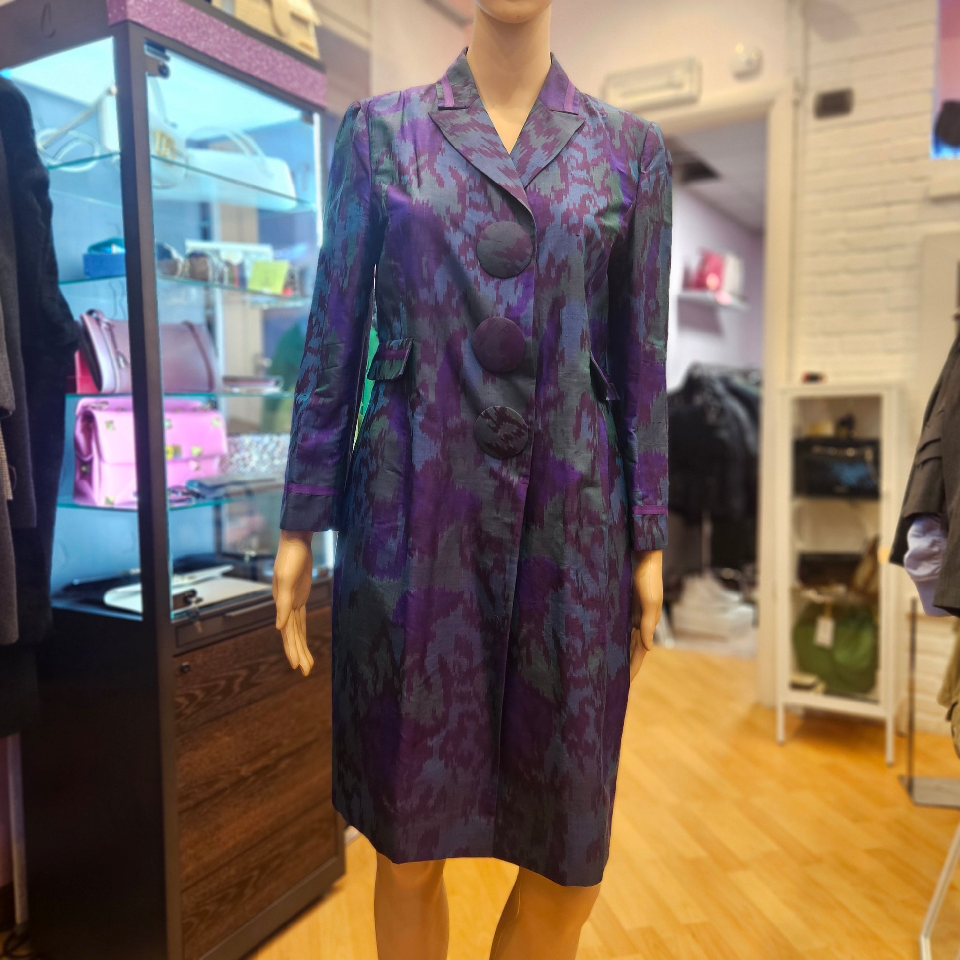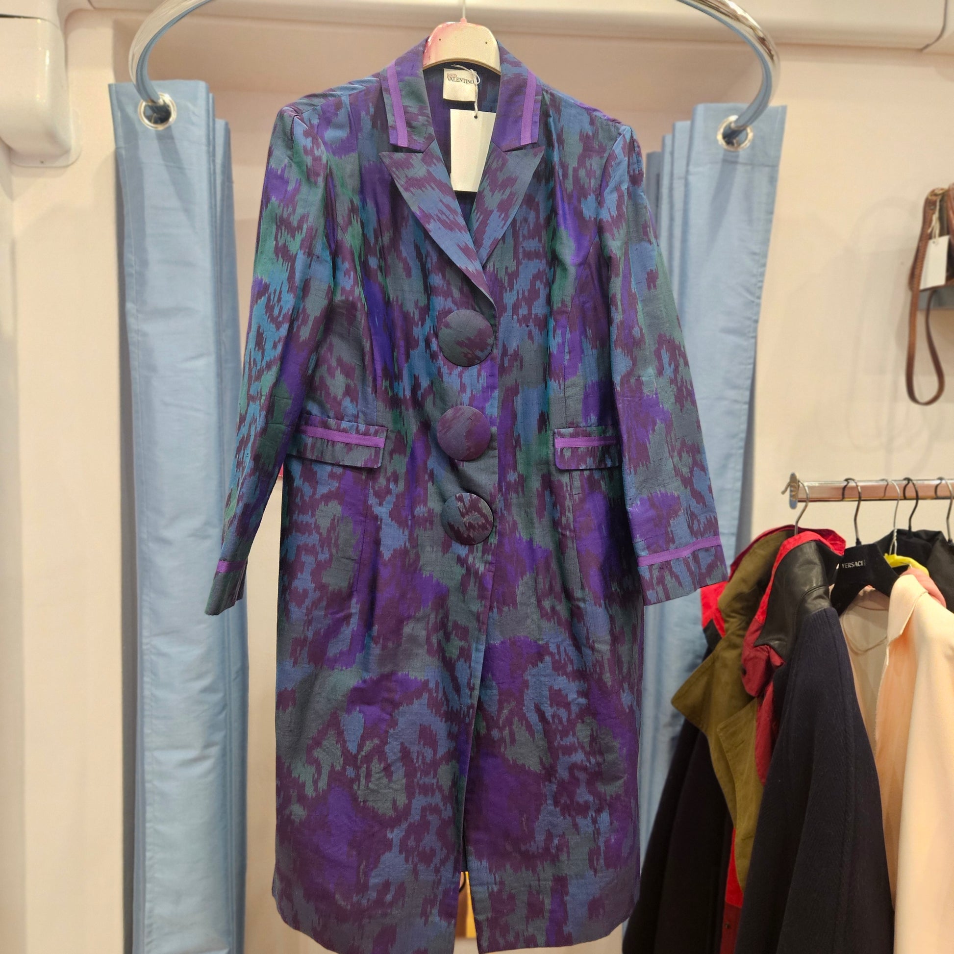 Trench Red Valentino in seta in colorazione viola, blu e verde, articolo in ottime condizioni.