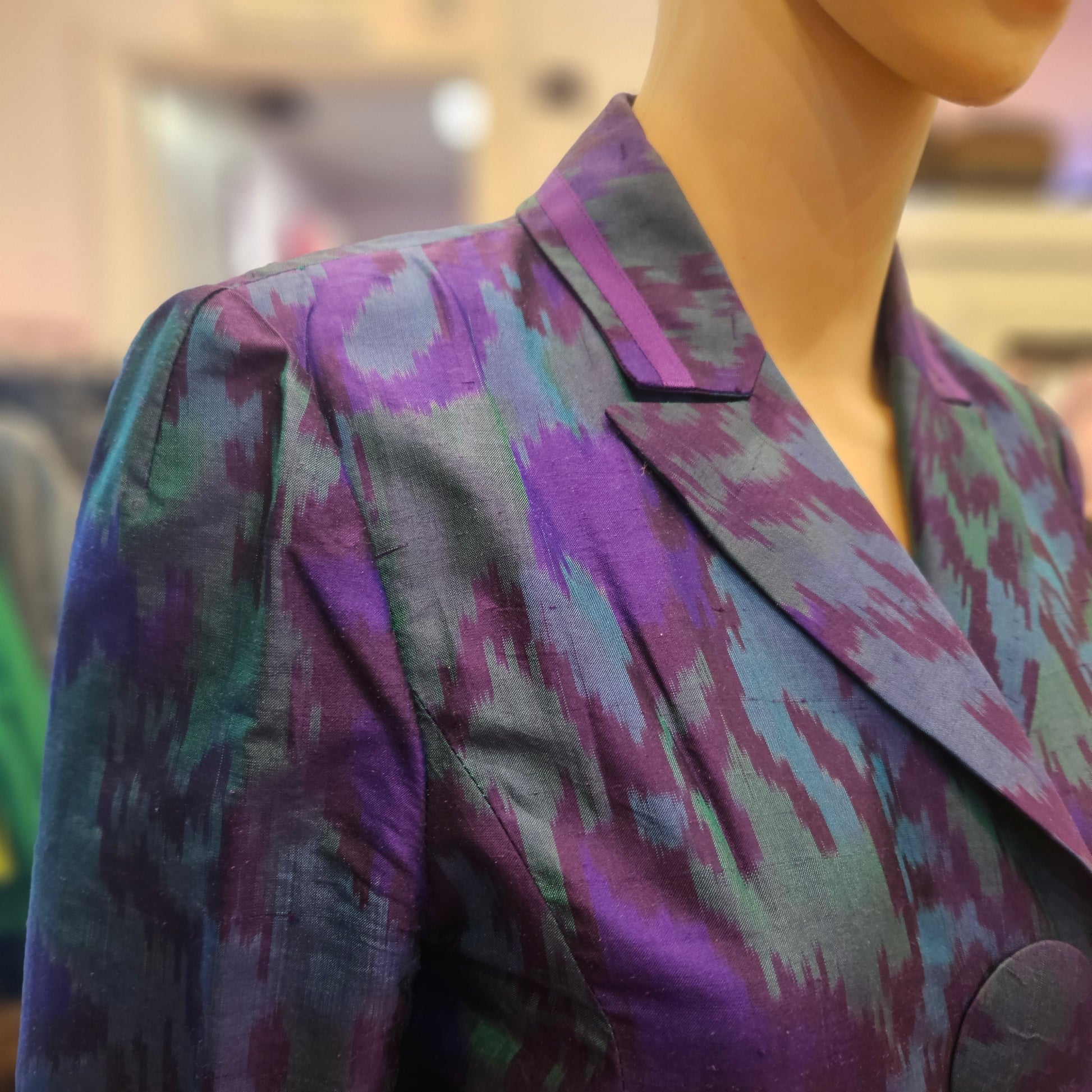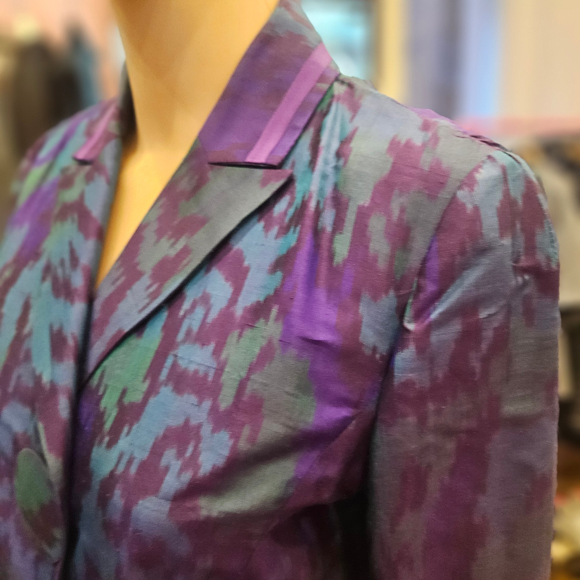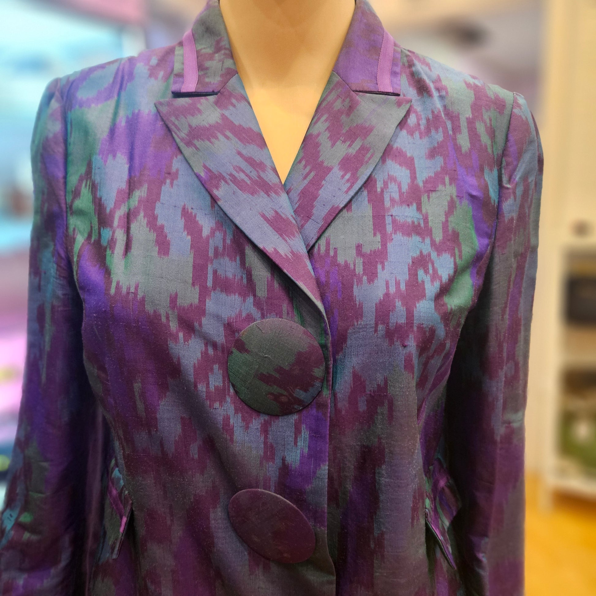 Trench Red Valentino in seta in colorazione viola, blu e verde, articolo in ottime condizioni.