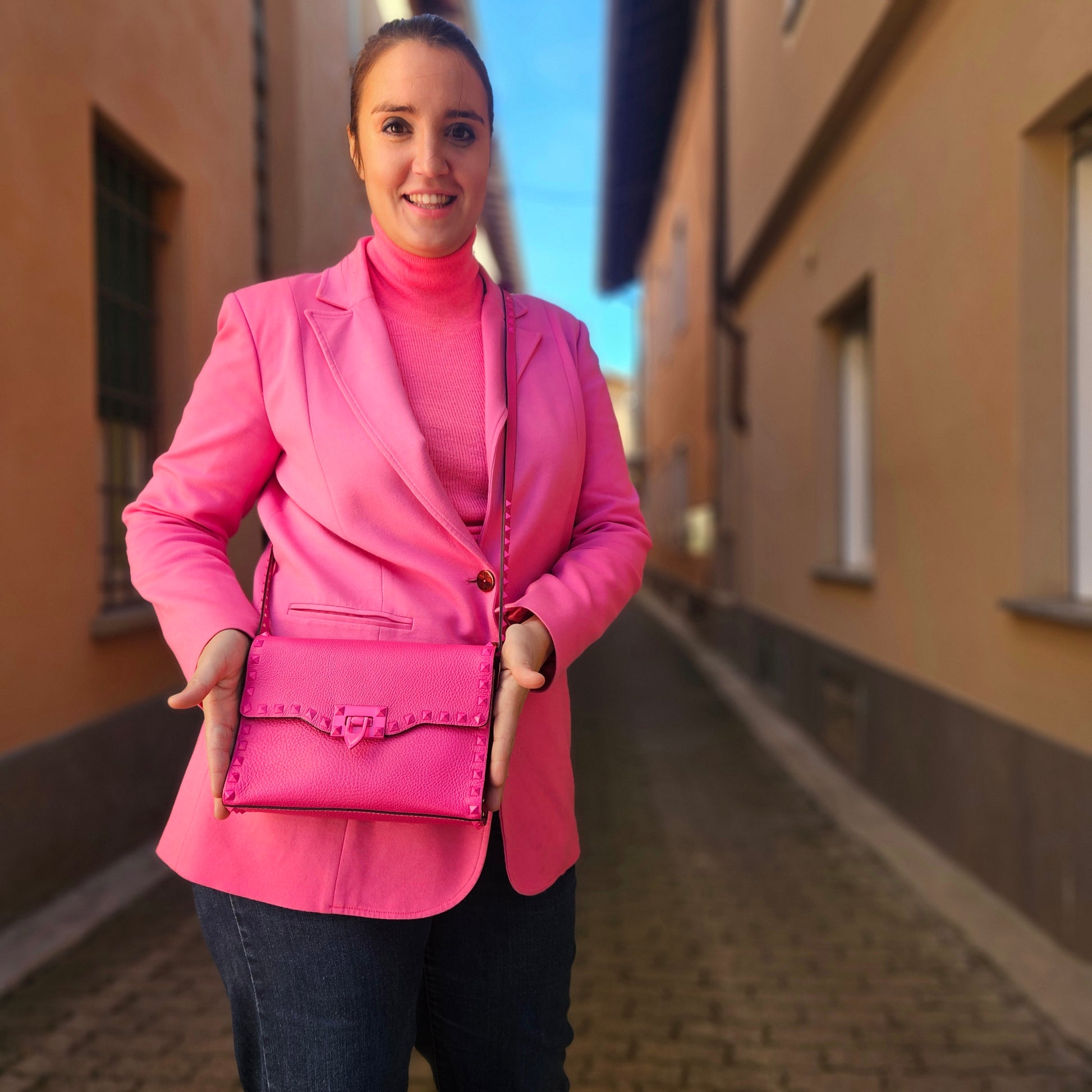 Borsa a tracolla Valentino Rockstud in pelle colorazione rosa e borchie rosa, borsa in condizioni più che ottime, non segnaliamo particolari segni ne su pelle ne su borchie e nemmeno all'interno.