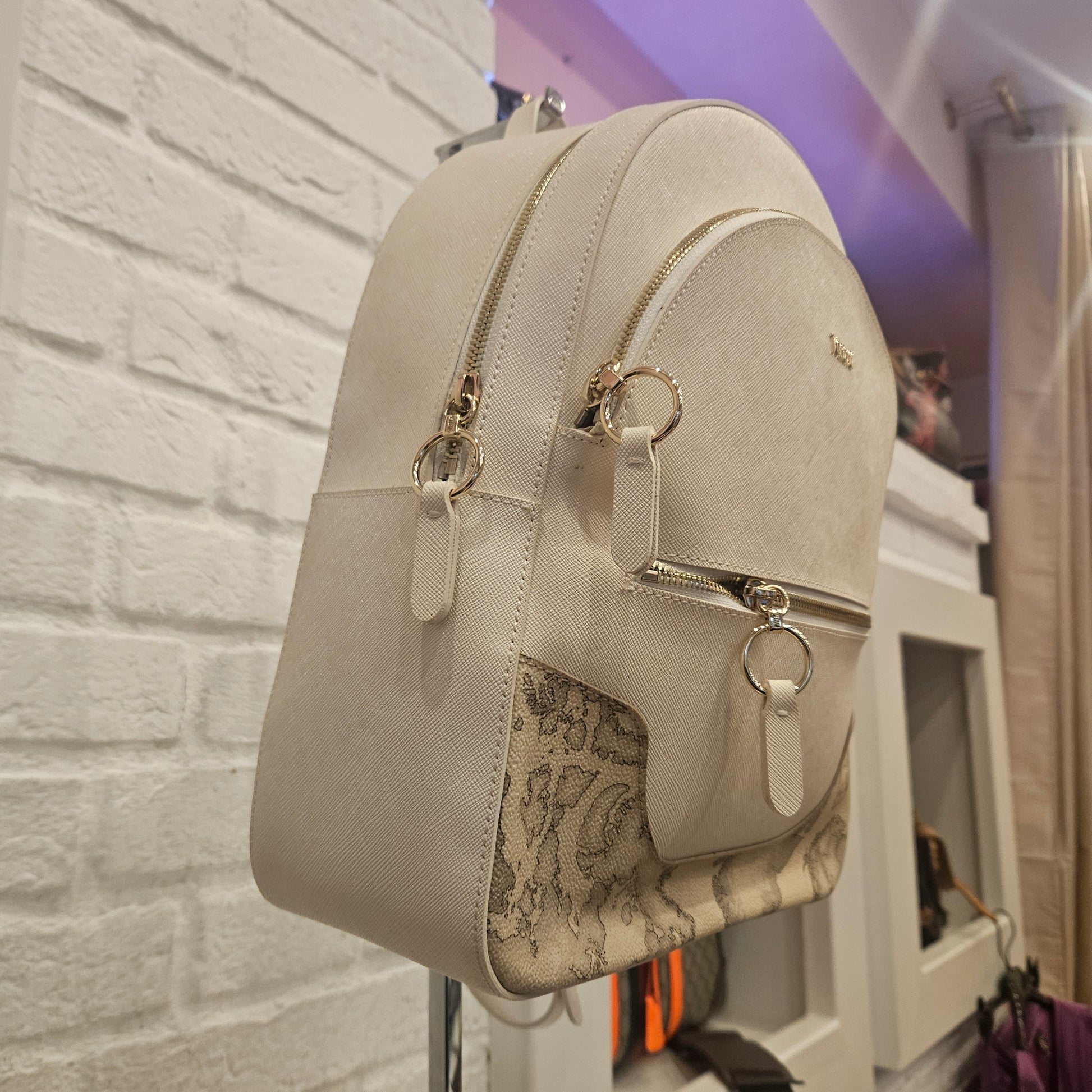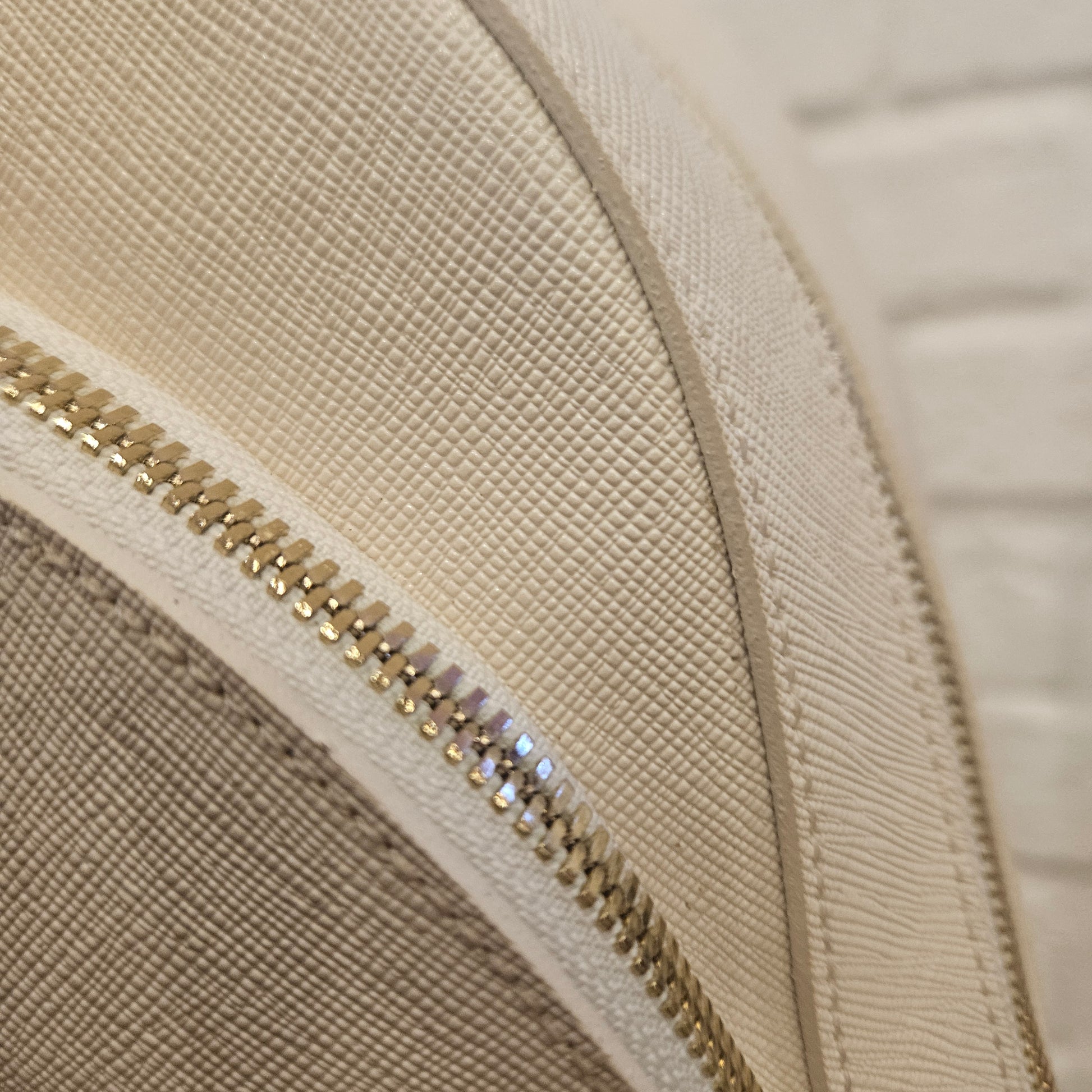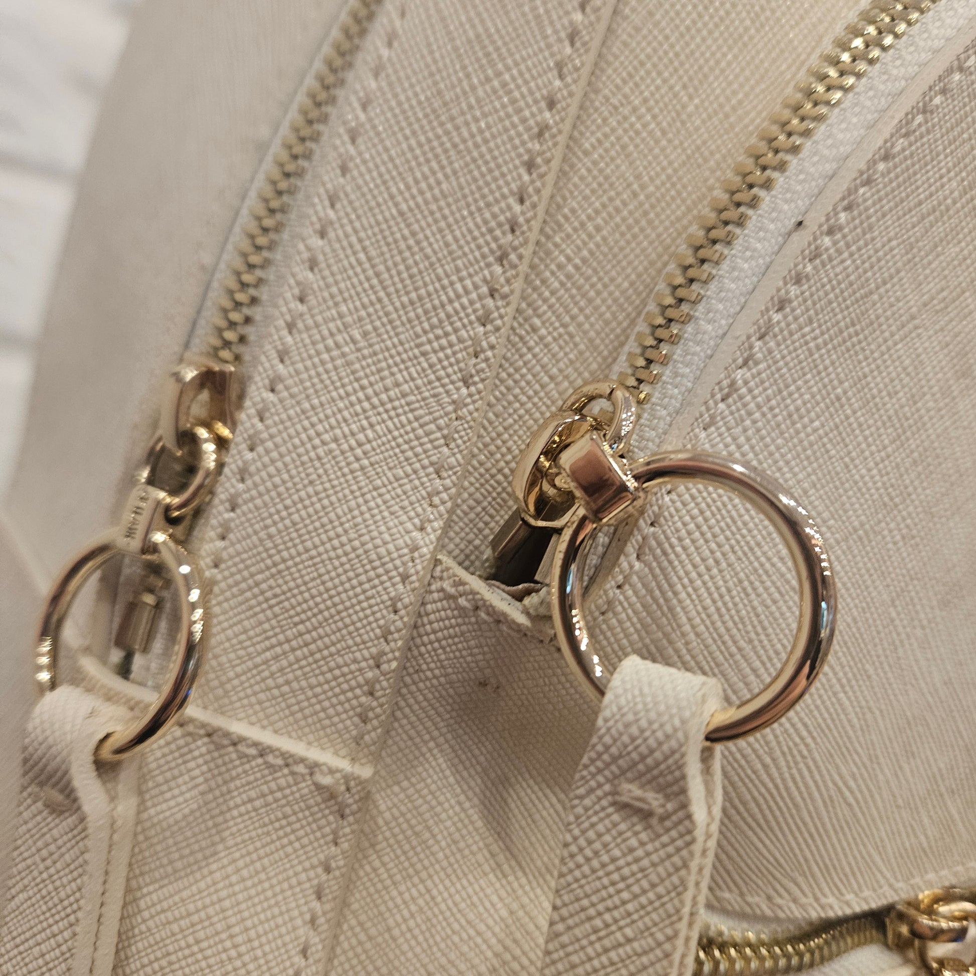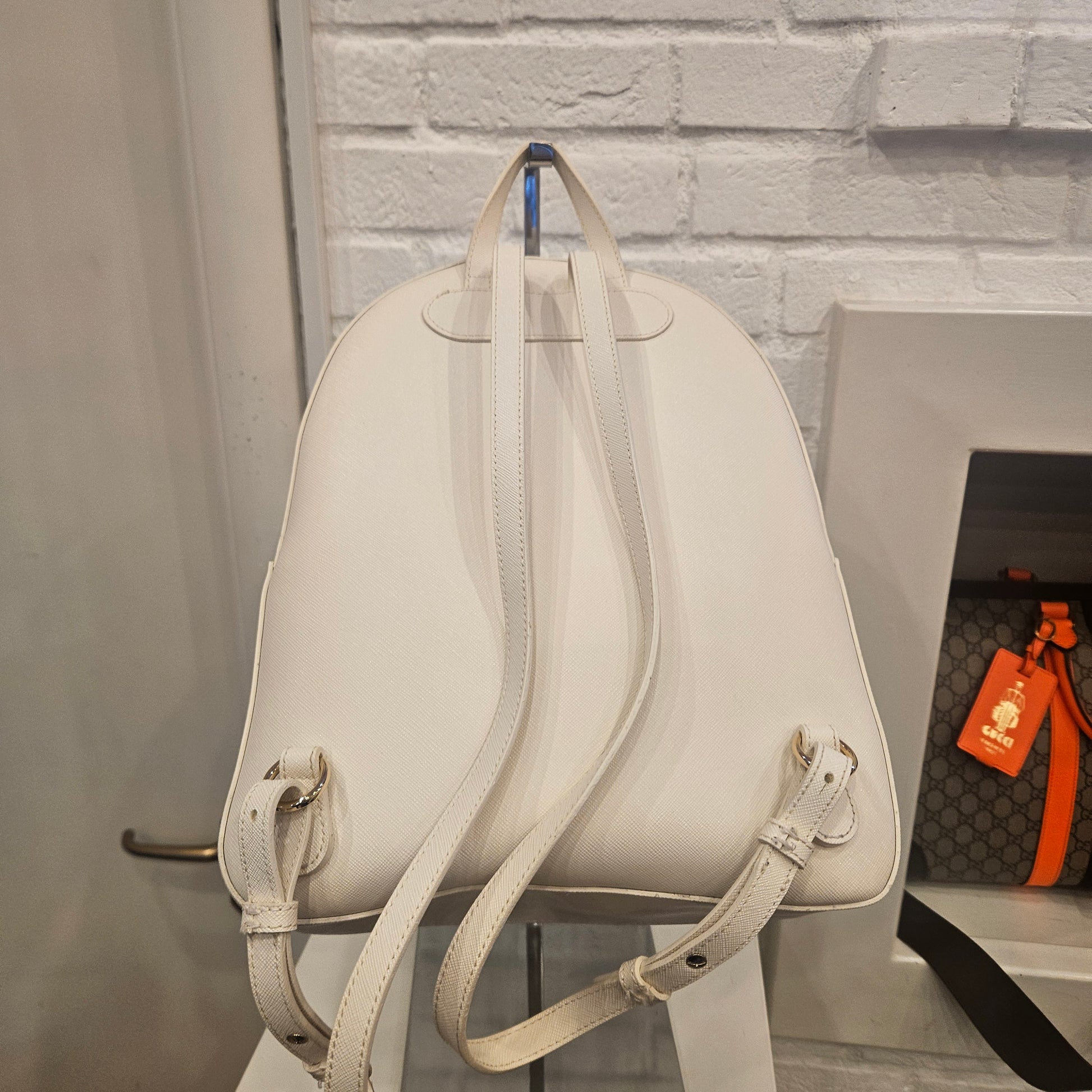 Zainetto Prima Classe in saffiano colorazione panna e dettagli metallici dorati, Zainetto in ottime condizioni pari al nuovo sia interne che esterne, due tasche frontali.