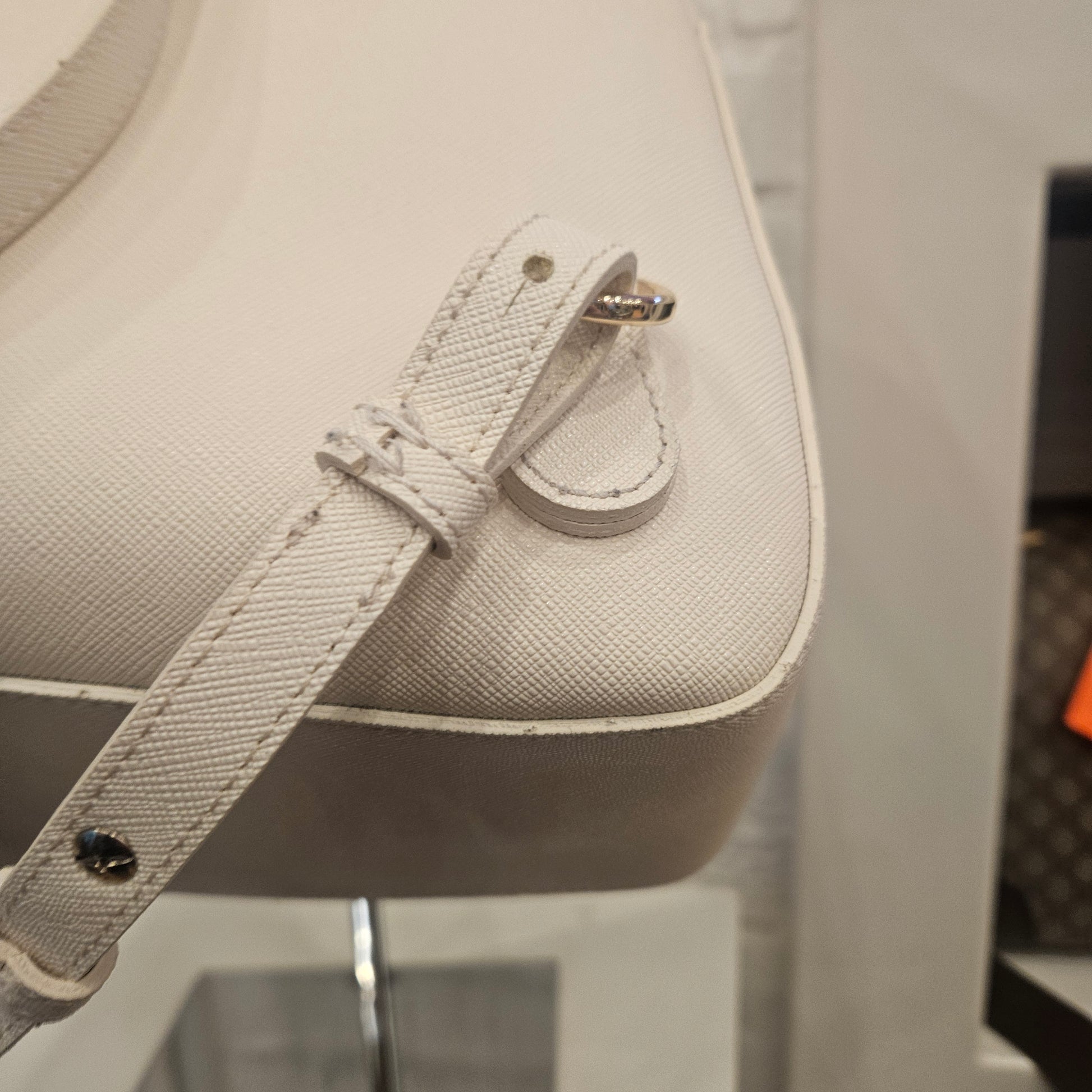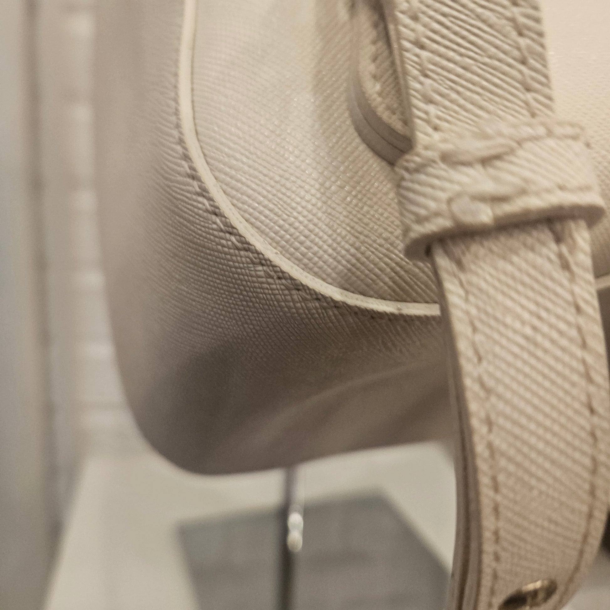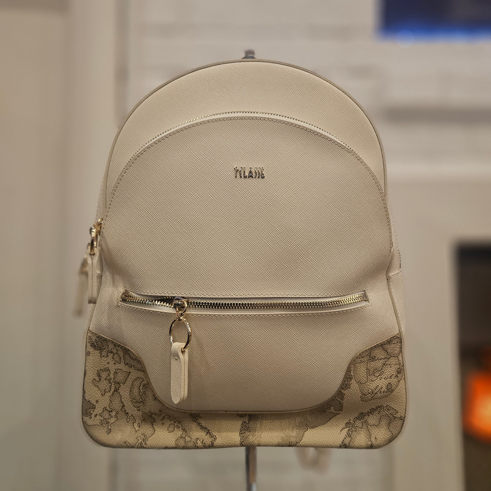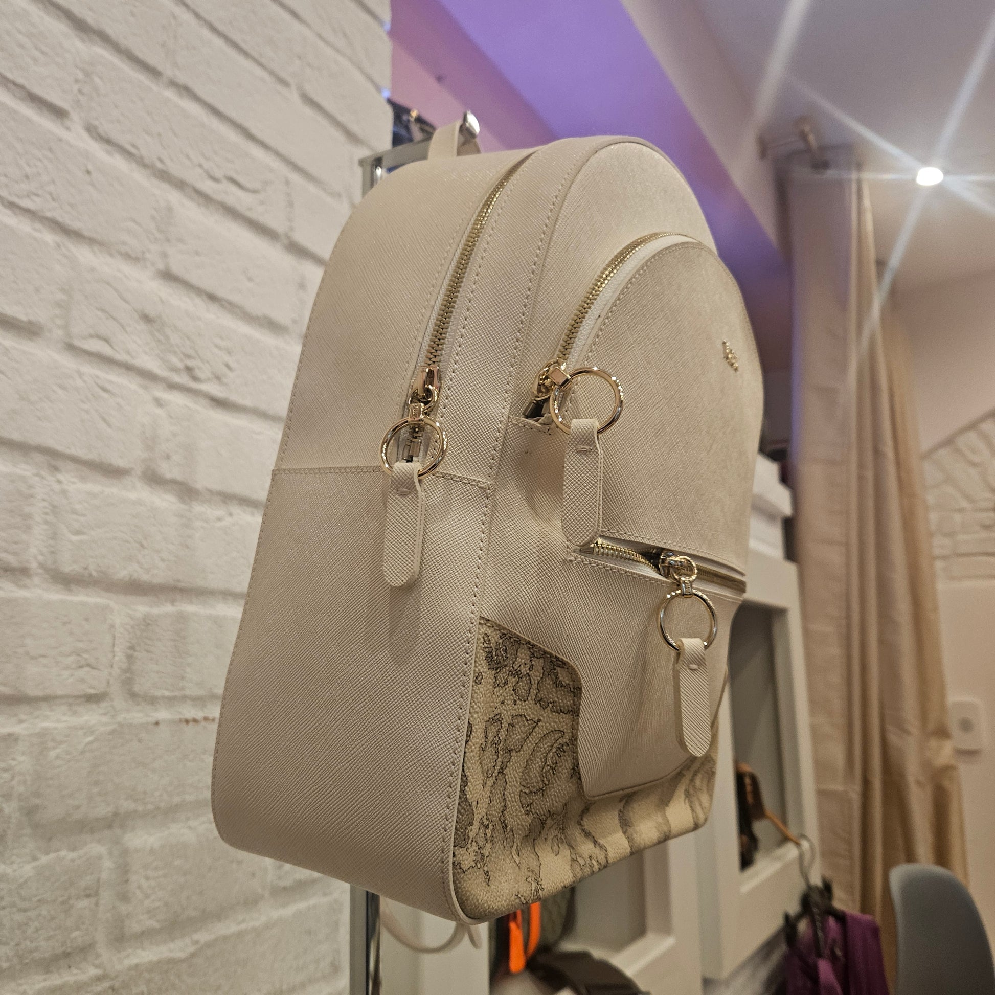 Zainetto Prima Classe in saffiano colorazione panna e dettagli metallici dorati, Zainetto in ottime condizioni pari al nuovo sia interne che esterne, due tasche frontali.